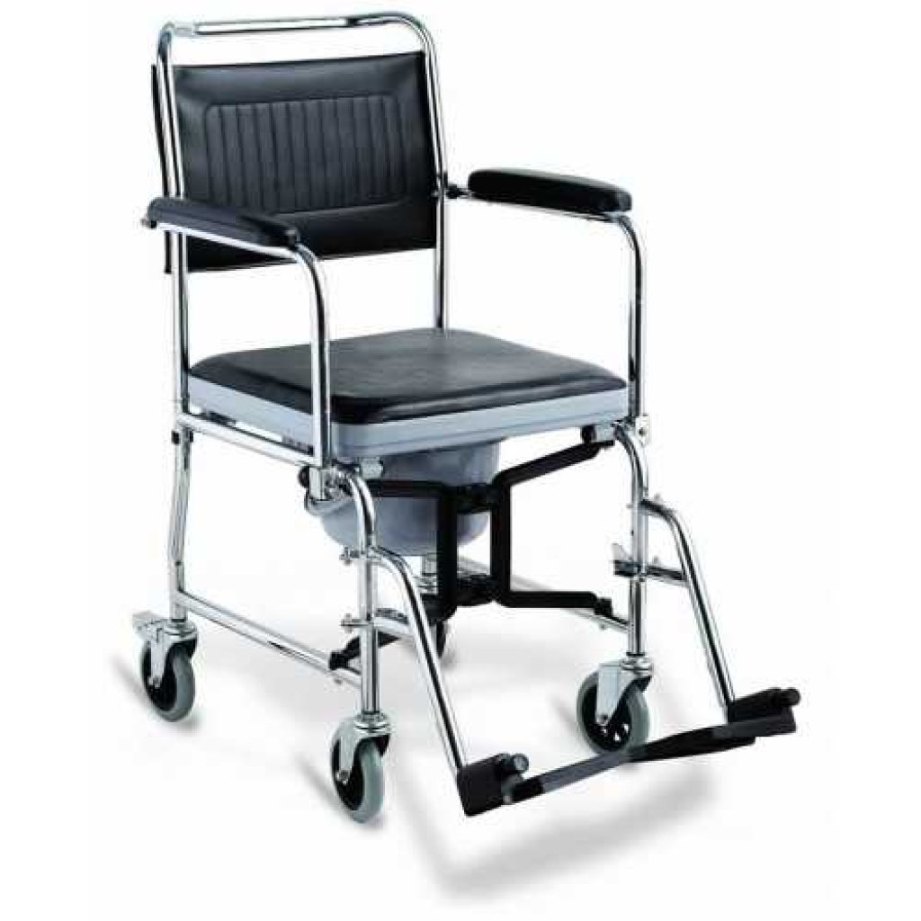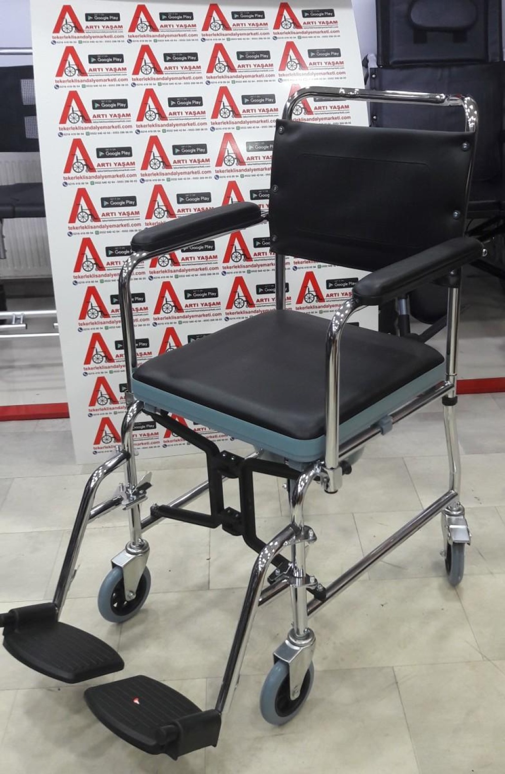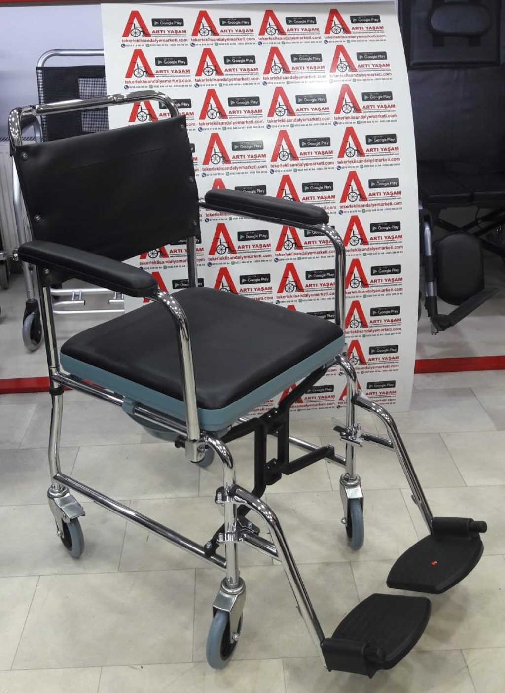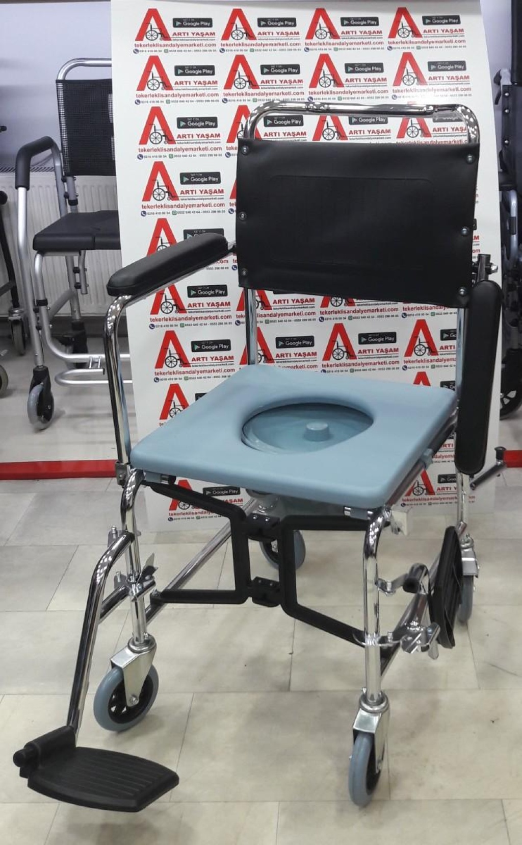 *Krom kaplamalı çelik şasiye sahip, katlanabilir özellikli banyo ve tuvalet sandalyesidir. Aşağı doğru açılabilir kolçaklara ve çıkarılabilir ayaklıklara sahiptir